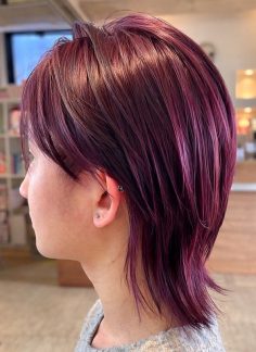 初カラーで、ブリーチ&カラーで ボルドーカラーに挑戦しました ボルドーは、ツヤ感があっていいですよね カットは、ウルフカットで オイルをつけただけで束感が出て 楽ちんスタイルです 春に ツヤ感カラーXレイヤースタイルは チャレンジしてみませんか? 西田奈津希 #ボルドーカラー #ブリーチオンカラー #野々市美容室マニス #manis